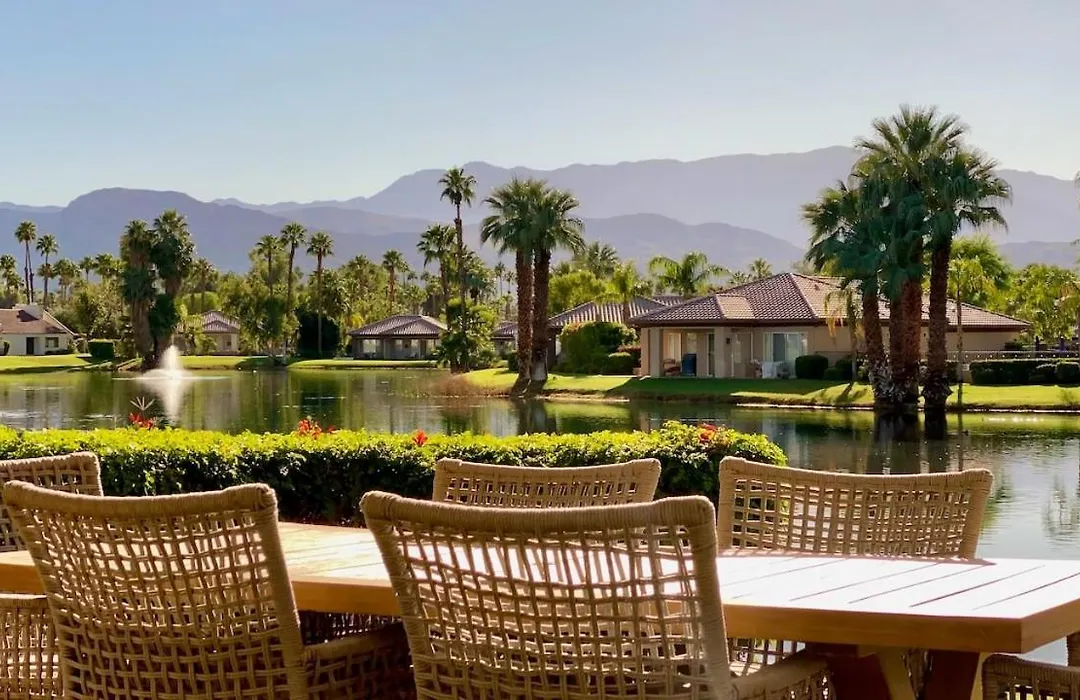 The Rancho Mirage property comprises a fully-fitted kitchen with a microwave oven, coffee and tea makers, and a refrigerator.